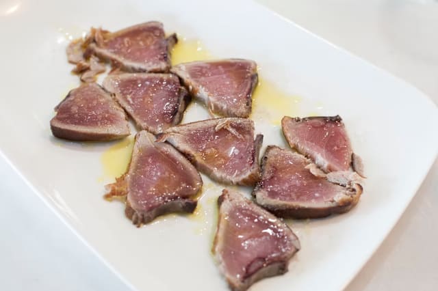 - Almejas a la sartén + chipirones a la plancha + atún rojo + botella de vino de la casa + postre de la casa