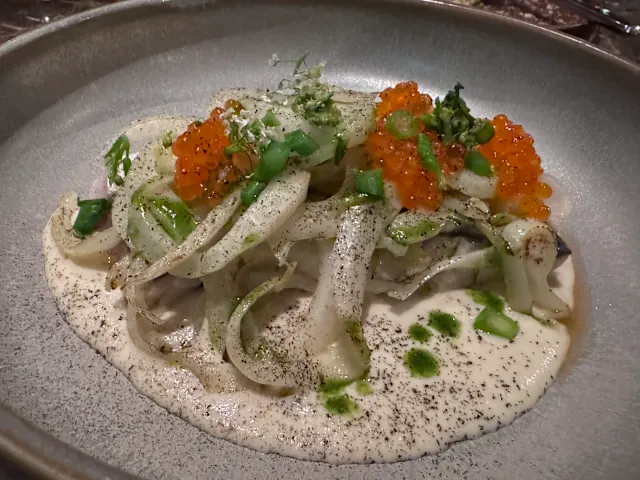 - Marinated mackerel | “ajo blanco" sauce | fennel | sweet peas
