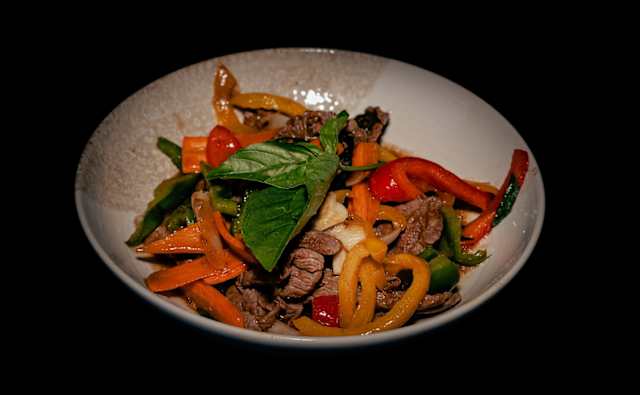 - Boeuf, poivron rouge, poivron vert, carotte, oignon, soja, basilic, cébette, sauce poivre