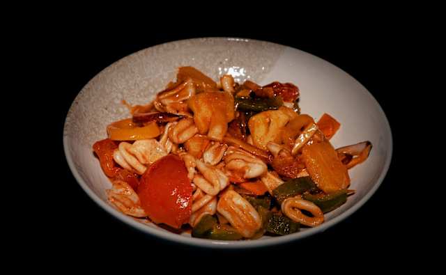 - Sèche, ananas, poivron rouge, poivron vert, oignon rouge, tomate, carotte, gingembre, ail, sauce huitre