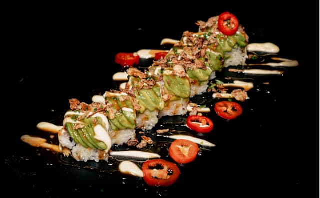 - Crevette tempura , avocat , poivrons , sauce mayonnaise spicy, riz vinaigre, sésame / topping : saumon, avocat, oignons crispy , ciboulette , olives noir, sauce mayonnaise spicy