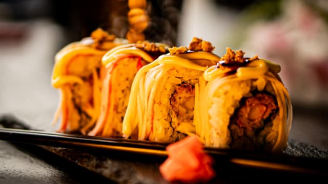 Gefrituurde garnalen, oranje visseneitjes, japanse mayo & avocado.