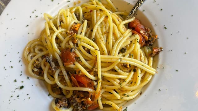 muscoli spezzini e pomodorini su una fetta di pane caldo