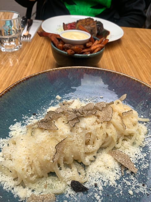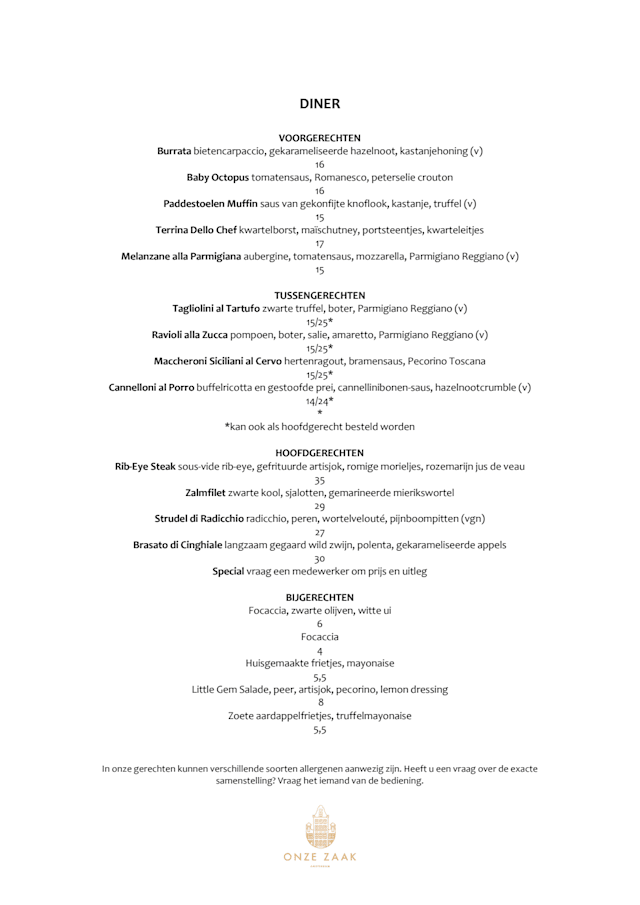 10/10Being educated in the hospitality industry, I found Onze Zaak's Team service very professional: Attentive and clear sense of service and the room management. Great food. I opted for a start and main course: Starter: MELANZANE ALLA PARMIGIANA (aubergine, tomatensaus, mozzarella, Parmigiano Reggiano). Nicely presented, and just the right quantity. Fresh and delicious. Main course: TAGLIOLINI AL TARTUFO The highlight of my experience. Truffle smell and taste to me means: "Regressive" in culinary terms. I travel back in time, to comfortable experiences. The cherry on top, a chardonnay aged in Oak suggestion ❤️. Thank you. You made my visit to Amsterdam way more pleasant.