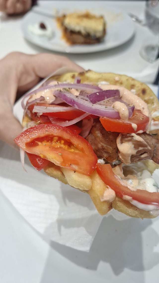 - Pita artigianale, spiedino di vitello, salsa tzatziki, cipolle di tropea, pomodoro fresco, origano, salsa piccante, patate fritte