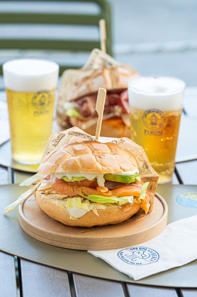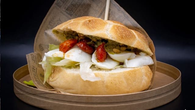 Pane tartaruga di semola con fiocchi di mortadella di cinghiale, mozzarella di bufala campana, crema di pistacchio di bronte e misticanza condita con olio evo di coratina