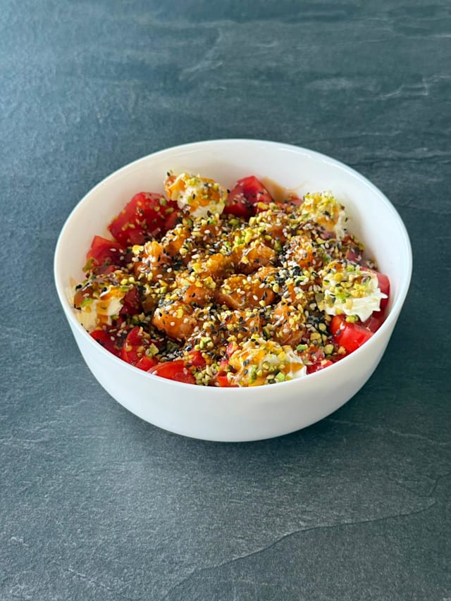 Tartare di salmone marinata con soia, olio e semi di sesamo, cipollotto e miele.