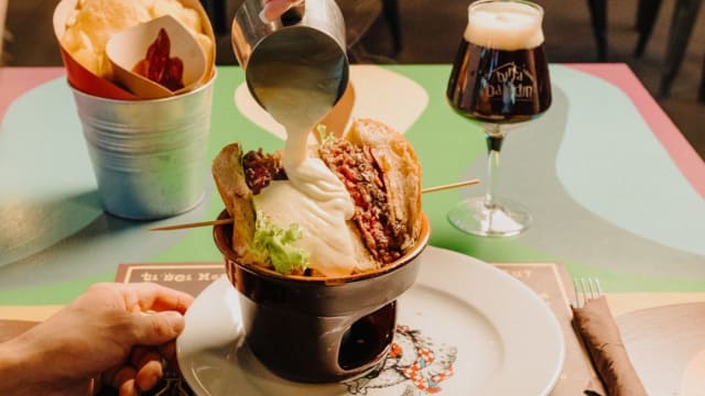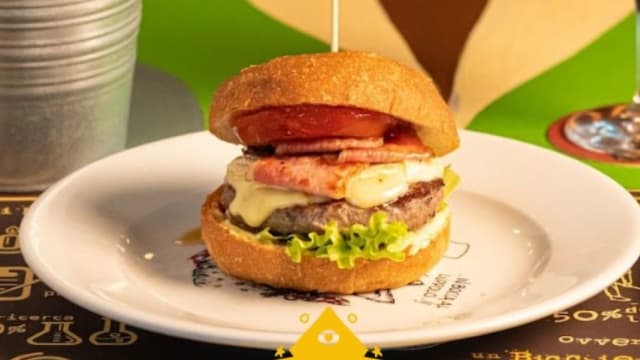 Pane all'olio panatè fatto in carcere, hamburger di bovino razza piemontese la granda presidio slow food, bacon, fonduta, cipolle di tropea alla birra, pomodoro, insalata, salsa rubra, maionese