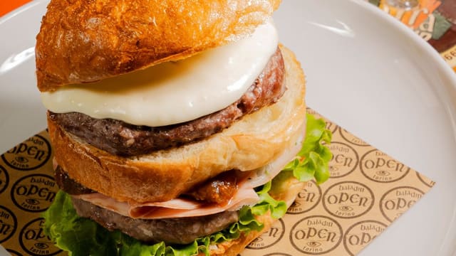 Pane all'olio panatè fatto in carcere, hamburger di bovino razza piemontese la granda presidio slow food, bacon, fonduta, cipolle di tropea alla birra, pomodoro, insalata, salsa rubra, maionese