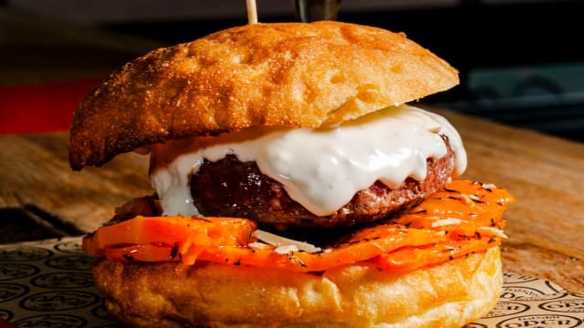 Pane all'olio panatè fatto in carcere, hamburger di bovino razza piemontese la granda presidio slow food, pomodoro, insalata, salsa rubra, maionese