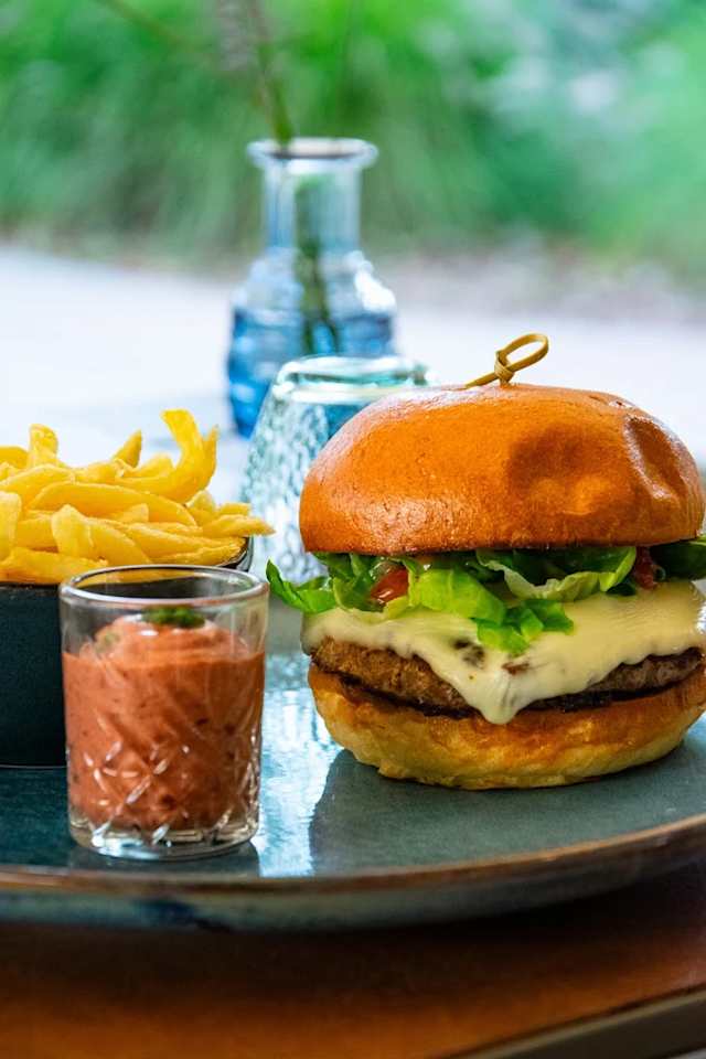 - Frites sauce cocktail, salade romaine, confit d’oignons, oignons frais, cornichons, tomates & bacon