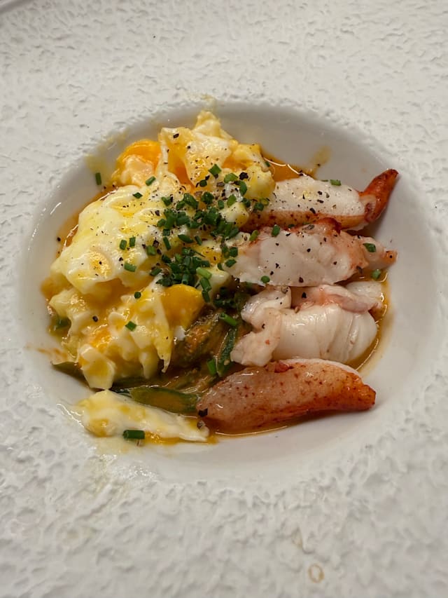 - Judía verde salteada al wok con un pesto de tomate y piñones, bogavante y huevo frito