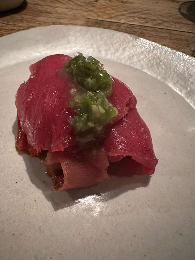 - Pan roti horneado a la brasa, mantequilla de hierbabuena, pluma ibérica cocinada a baja temperatura con curry, chalota y jengibre. Terminada a la brasa y acompañada con pimiento verde asado y mahonesa de comino.