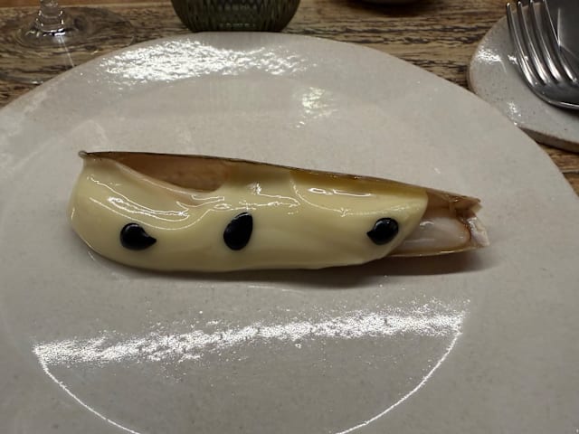 - Navaja gallega a la brasa, pil-pil ligero de ajo frito y mahonesa de sriracha