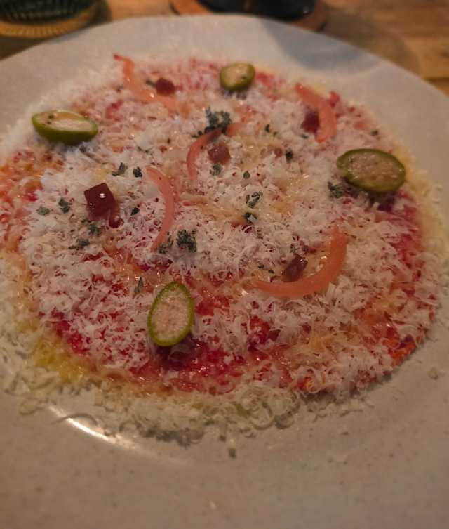 - Deshidratamos tomates hasta conseguir la textura de una carne roja. Lo acompañamos de cebolla encurtida, alcaparrones y parmesano. Terminamos con hueva en salazón rallada.