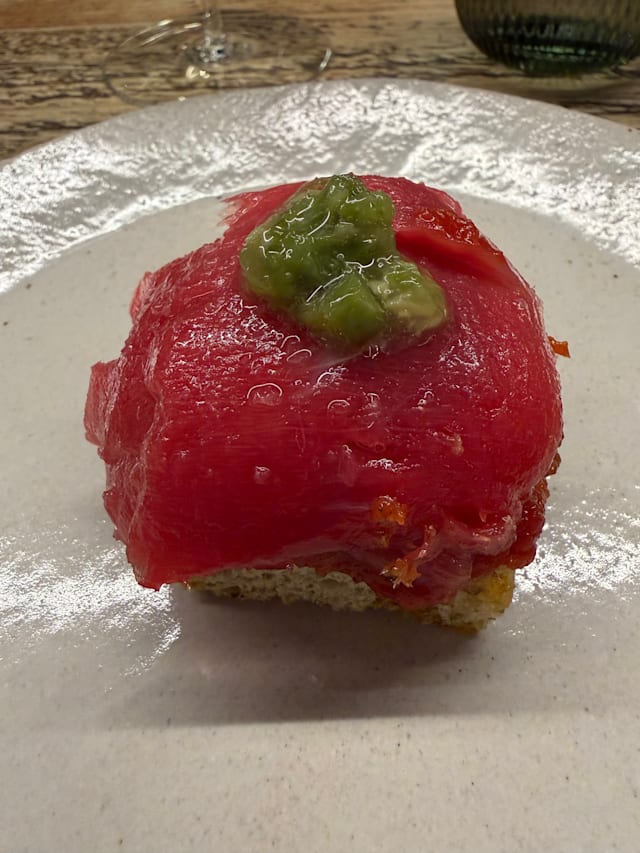 - Chapata de pan con algas, tomate guisado y atún rojo con wasabi fresco y un toque de albahaca