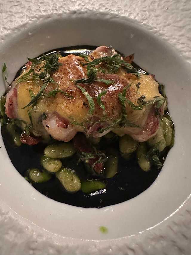 - Huevas de sepia marcadas a la sartén con mantequilla y guanciale, burrata fresca y albahaca tailandesa