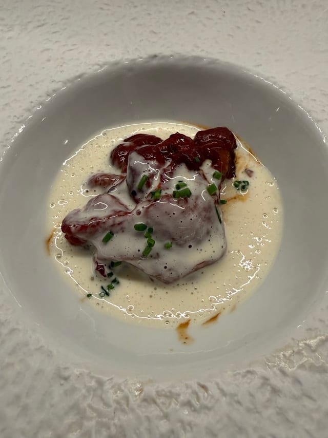- Rabo de vaca, guisado con panceta, chalota, ajo y vino blanco de jerez. Desmigado, lo enrollamos con foie y láminas de manzana verde por dentro. Acompañado con la salsa del guiso, chocolate blanco, miel y vinagre.