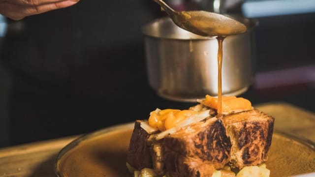 Pan roti horneado a la brasa, mantequilla de hierbabuena, pluma ibérica cocinada a baja temperatura con curry, chalota y jengibre. Terminada a la brasa y acompañada con pimiento verde asado y mahonesa de comino.