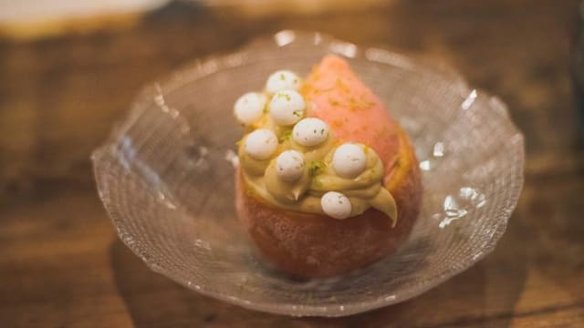 Pomelo con eucalipto, crema inglesa de miel, helado de naranja sanguina con campari, merengue seco y ralladura de lima. Todo dentro de una piel de naranja.