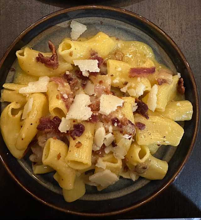 - Rigatoni alla carbonara: pâtes fraîches, œuf, parmesan pecorino et guanciale
