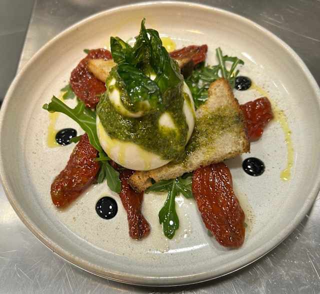 - Burrata, tomates séchées,roquette et pesto de basilic