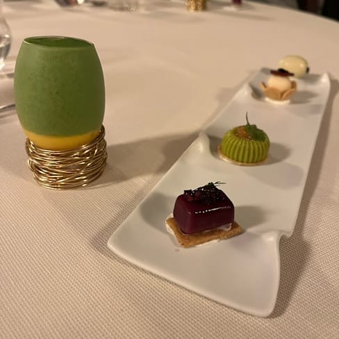 10/10Our experience at Opera was wonderful. We had the tasting plate, I had the Opera and my wife had the Tomato (vegetarian). You start and end with house tastings, both sweet and savory. The service was the finest, every person was a master at their craft and conversational in several languages. We have eaten at other Michelin restaurants and this experience was one of our finest. This was four hours well spent with our newest friends.