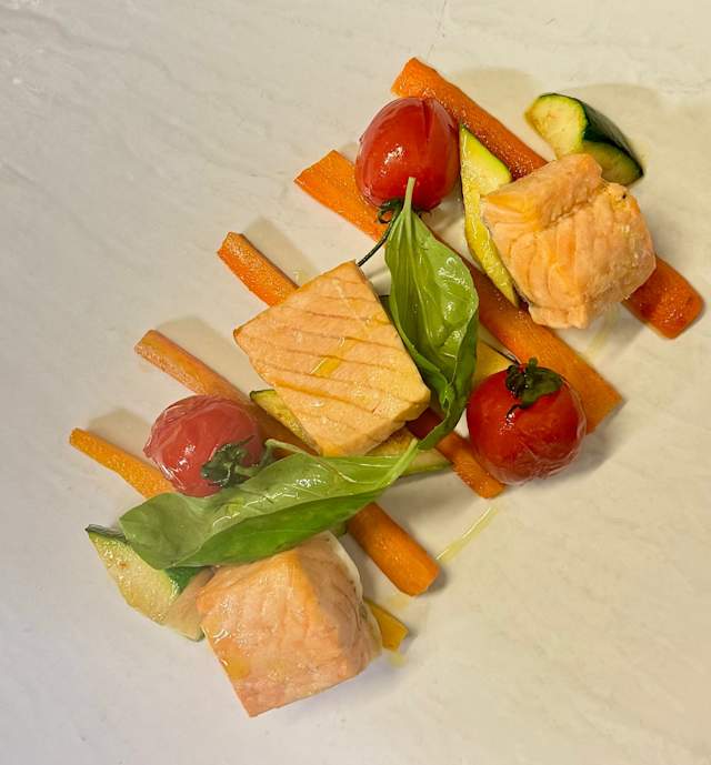 - Trancio di salmone al forno, zucchine, carote e broccoli al vapore