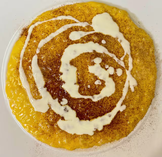 - Risotto mantecato con crema di zucca, fonduta di provolone e polvere di liquirizia