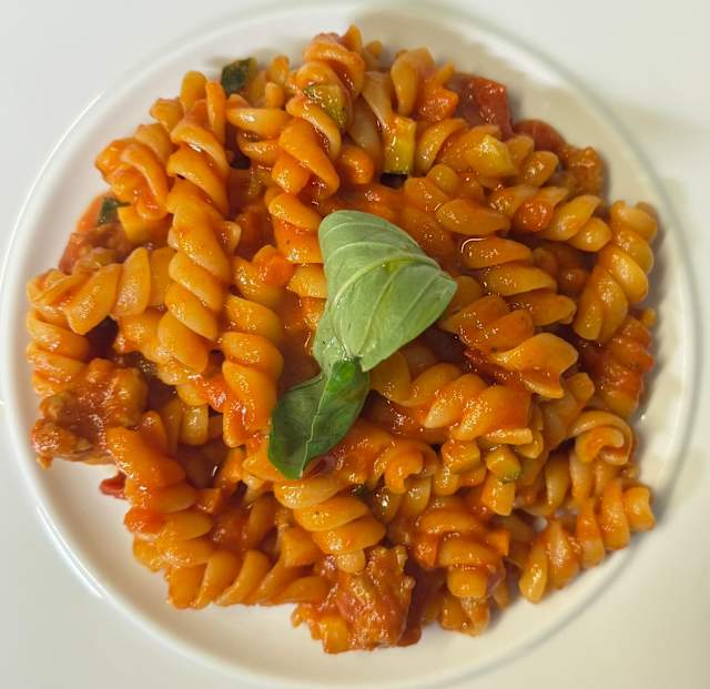 - Con ragù di salsiccia, verdurine croccanti e pomodorini