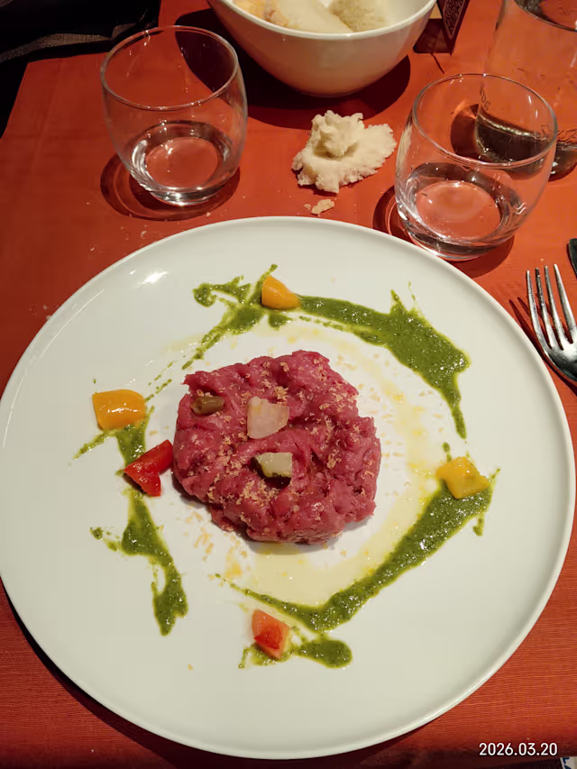 - Battuta di manzo con salsa verde, giardiniera e tuorlo marinato