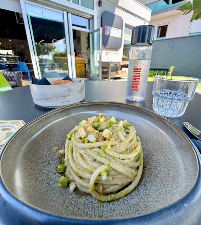 Pasta fresca fatta in casa, pesto di rucola, crema di parmigiano e mandorle