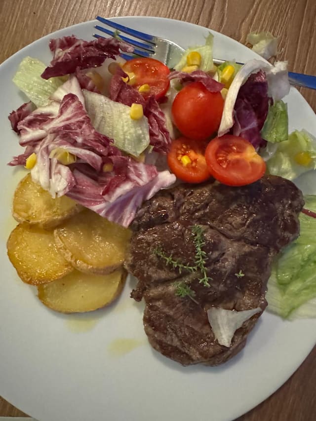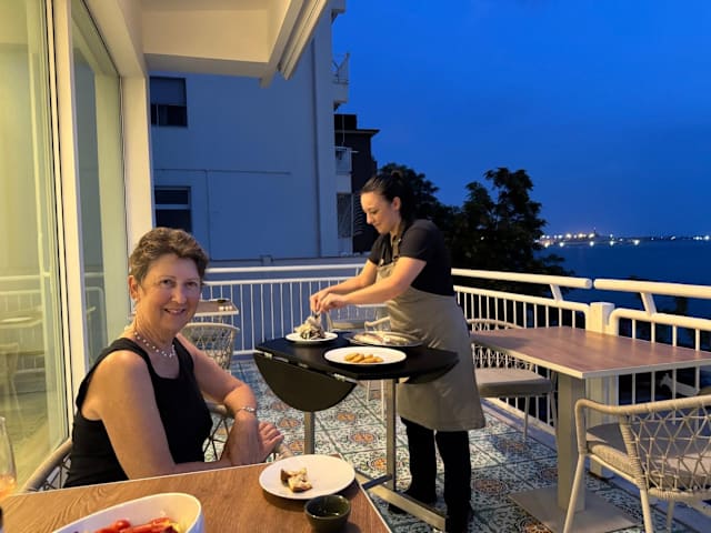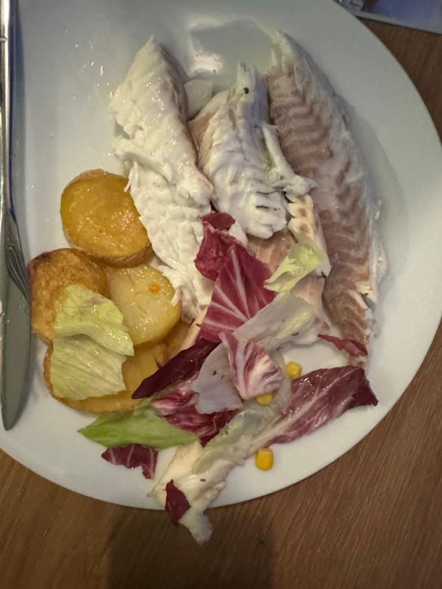 10/10The restaurant is in the hotel where we are staying and has a terrace overlooking the sea. We had the beef entrecôte steak and the fish. When the fish arrived Manuela served it and asked in perfect English if we would like her to remove the head, tail skin and bones which she did expertly and quickly. It was delicious as was the mixed salad and steak