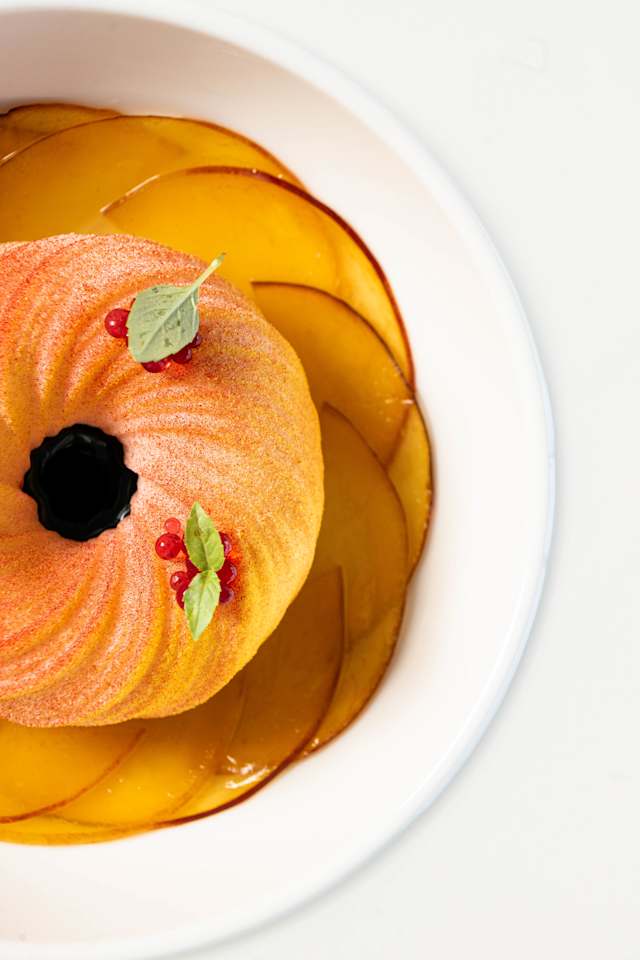 - Vanilla and passion fruit mousse, basil namelaka, and lime crumble