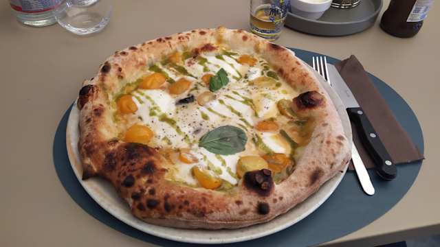 - Fiordilatte, melanzane fritte, pomodorino datterino giallo infornato semi-dry, chips di melanzane, fonduta di ricotta salata, pesto di basilico