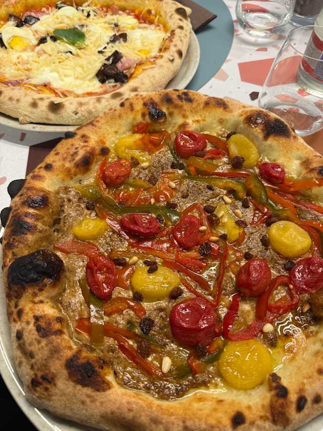 - Provola affumicata, filetti di tonno dolce, peperoni in agrodolce, crumble di olive, origano, basilico