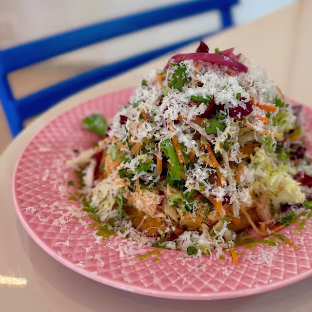 - Tortillas de harina de maíz fritas con carne de pollo, ensalada de repollo, salsa y queso.