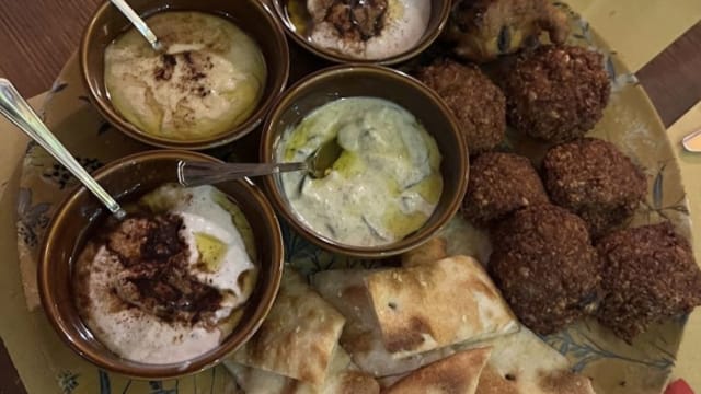 Antipasto misto (2 falafel, 2 pakora, pita e 2 salse)