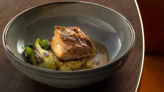 Branzino, yuzu miso, pan di zucchero, zenzero marinato e patata dolce fritta.