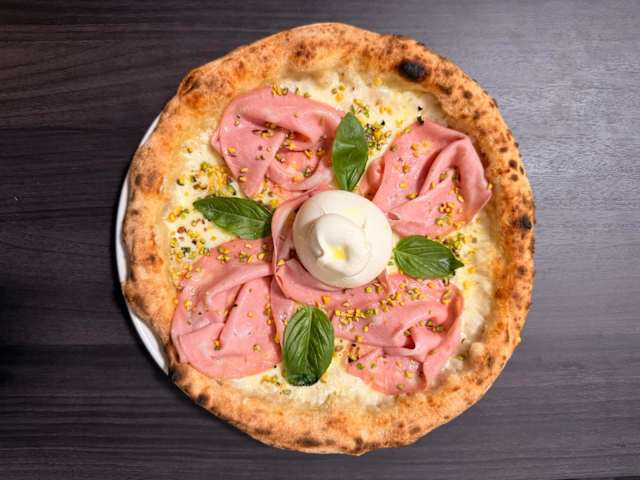 Fior di latte di agerola, mortadella, burrata di andria 125g, granella di pistacchio, zest di limone, basilico, olio evo