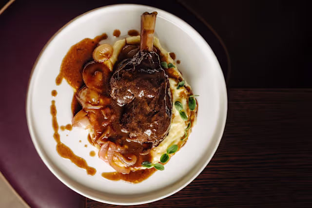 - Jarret d' agneau braisé au vin rouge, oignons tropea caramélisés et purée de pommes de terre