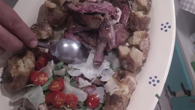 Grazie mille ma credo che abbia sbagliato locale noi serviamo tutti con rispetto ed educazione ma se le è sembrato così le chiedo scusa x quanto riguarda il prezzo molto alto 62 euro x 4 persone neanche al bar considerato che avete preso 1 orecchiette al pomodoro 1 tagliata di vitello 2 contorni 2 bottiglie d acqua 1 calice di vino e caffè la prossima volta fatevi 2 panini in salumeria al posto di sminuire il lavoro dei miei ragazzi la ringraziamo ancora
