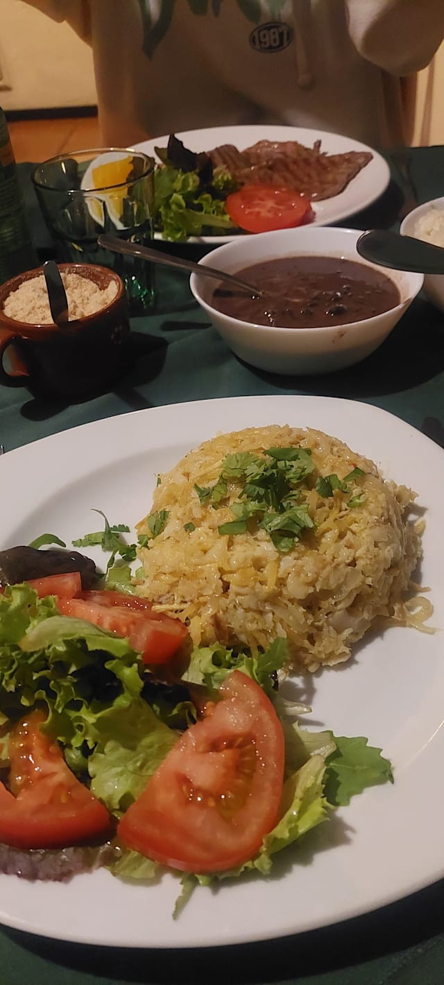 Camarão em creme de mandioca refogado com todos os temperos. Acompanha arroz branco