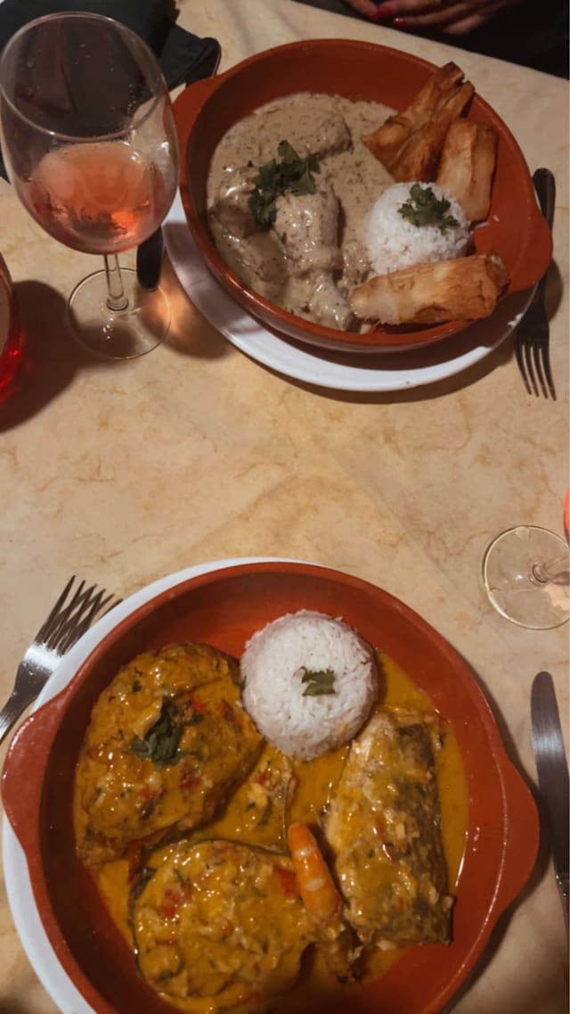 Ensopado de peixe e frutos do mar com todos os temperos, azeite de dendê e leite de coco. Acompanha com arroz branco