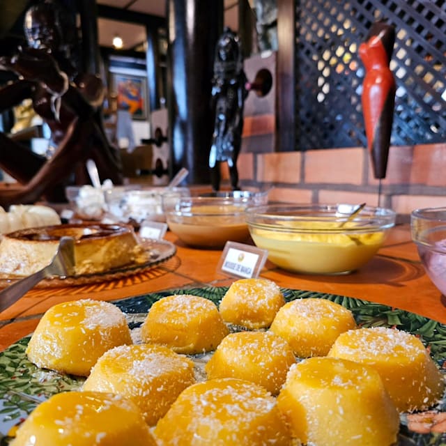 Creme elaborado com pão, azeite de dendê, leite de coco, castanha de caju, amendoim, camarão seco, gengibre, tomate, pimentos, coentros, peixe. Acompanha arroz branco e moqueca de camarão