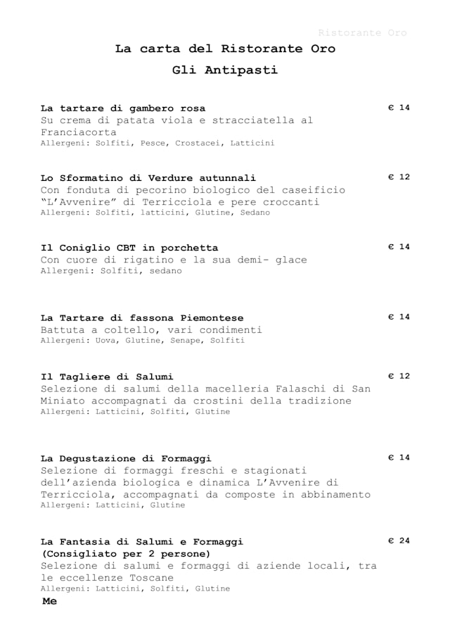5.5/10Very nice restaurant. The staff is very friendly. They not very busy so the staff did hover a bit too much. Menu was very limited, with the repeating of 5-6 items over and over again in appetizer first course and second course. We ordered a risotto dish and a pasta dish. Both were quite undercooked. I understand this is Italy, but al dente was taken a little too far.