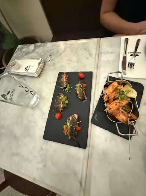 10/10We thoroughly enjoyed our experience at Orchidea. Arriving relatively early, the restaurant was quiet when we arrived, but the owner immediately welcomed and seated us comfortably. He brought over the chalk board menu and patiently explained the many offerings. We decided upon the covert (delicious bread and sausage instilled (!) butter), the shrimp sauteed in garlic and chili oil, and the pulled pork. We asked for recommendations for wine by the glass. Everything was delicious and perfectly prepared. Wine choices were great. This might have been our best meal in Lisbon. So good!