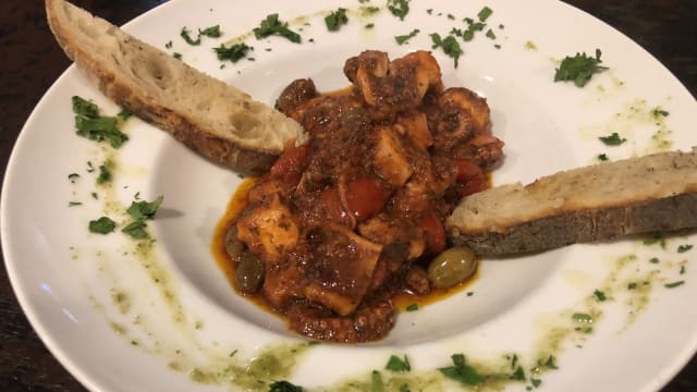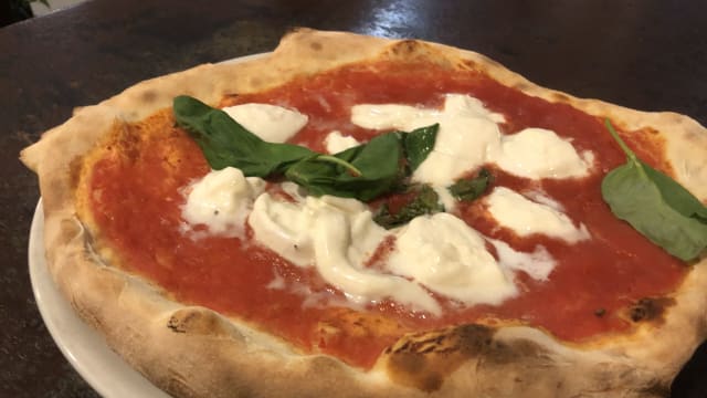 Pomodoro, mozzarella, spianata calabra, olive taggiasche e zola
