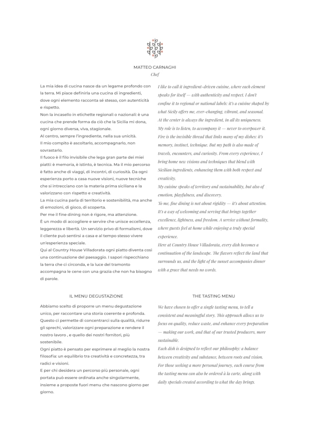 Abbiamo scelto di proporre un menu degustazione unico per raccontare una storia coerente e profonda. E per chi desidera un percorso piu personale, ogni portata può essere ordinata singolamente, insieme a proposte fuori menu che nascono giorno per giorno.