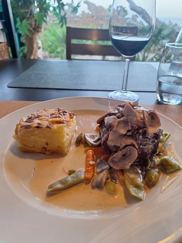 10/10It was a delightful meal outdoors, overlooking a stunning view, and accompanied by the sunset. The food was delicious, and the staff was friendly and helpful. It's definitely worth choosing a meat-based option; everything from salads to main courses to desserts was delicious.